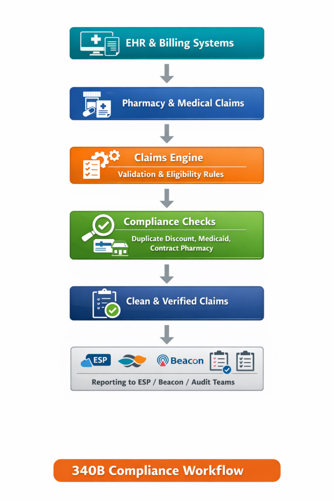 340B software is a technology platform designed to manage, validate, and monitor all data and workflows related to the 340B Drug Pricing Program. It matters because the program operates at the intersection of pharmacy claims, medical claims, EHR data, and manufacturer reporting requirements.